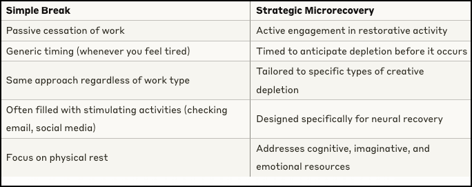 But there’s a crucial distinction between generic break-taking and what I call Microrecovery—strategically designed brief renewal periods that address specific types of creative depletion before they become severe.